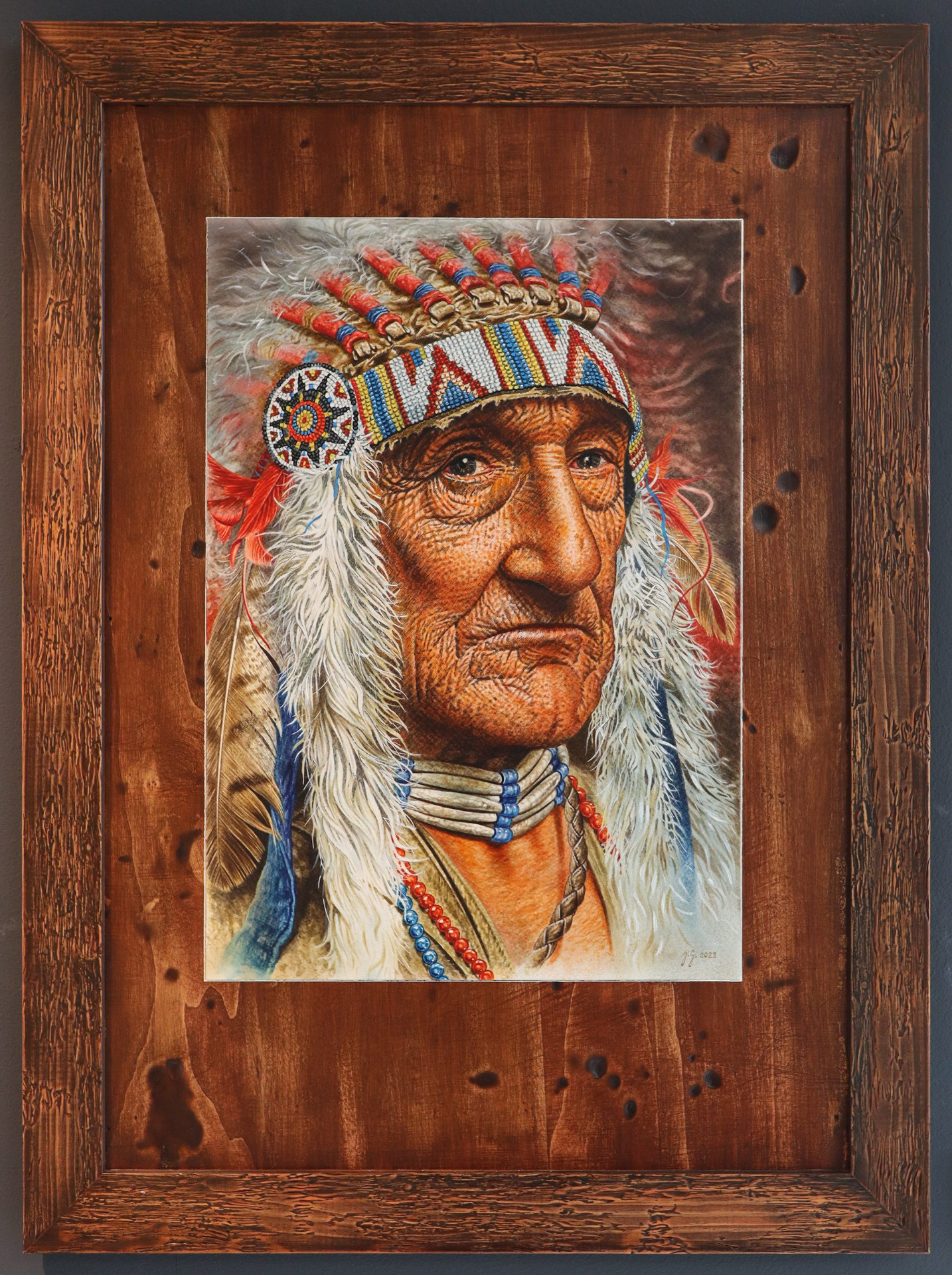 Autor: Jiří GrbavčicNázev: Starý náčelníkTechnika: kombinovaná technika, karton na dřevě Rozměr bez rámu: 42 x 30 cm Rozměr s rámem: