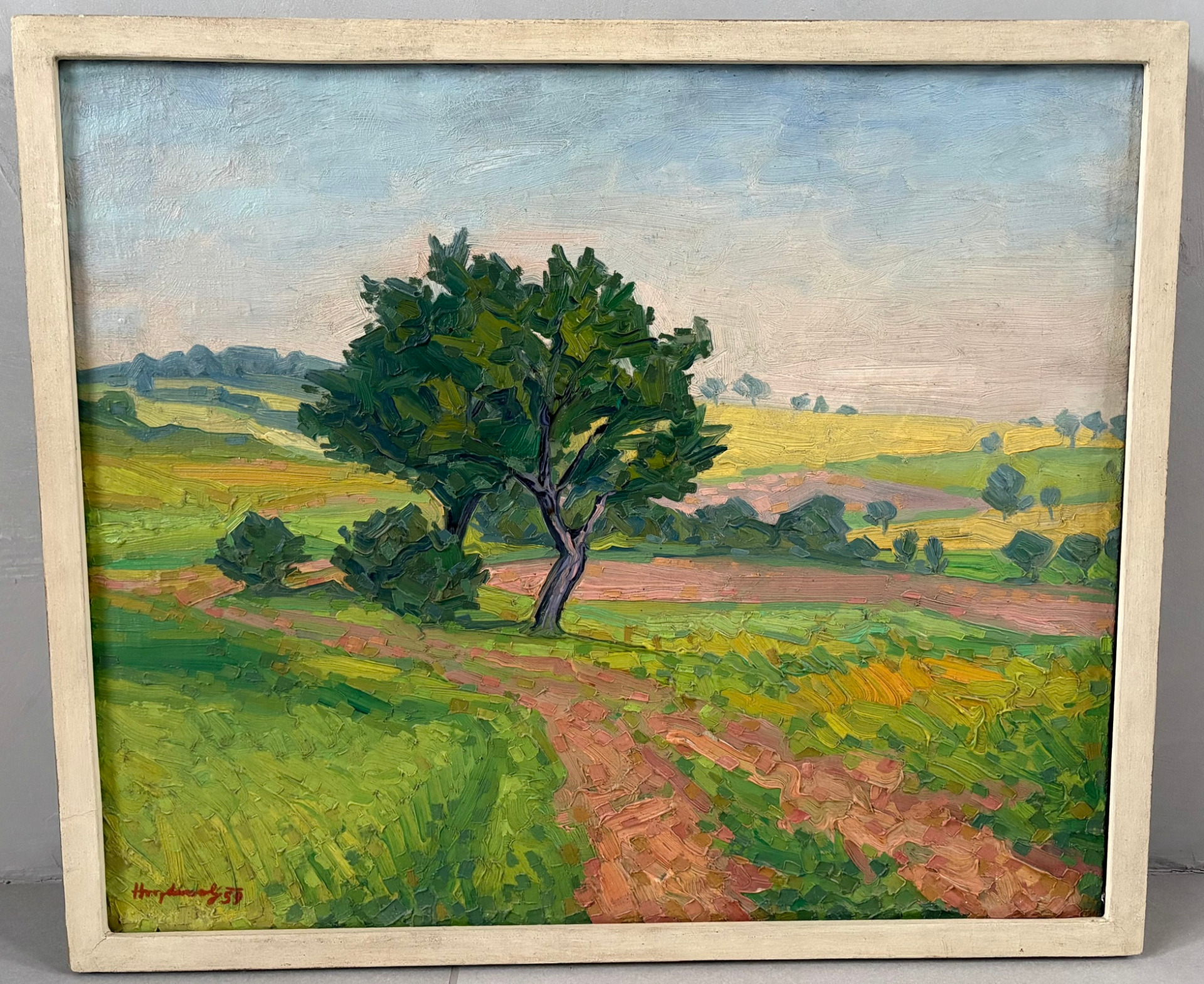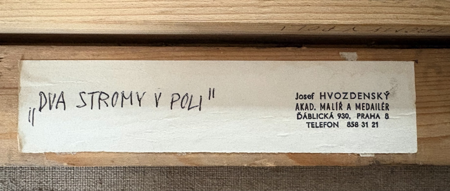 Autor: Josef HvozdenskýNázev: Dva stromy v poliTechnika: olej na plátně Rozměr bez rámu: 50 x 59 cm Rozměr s rámem: