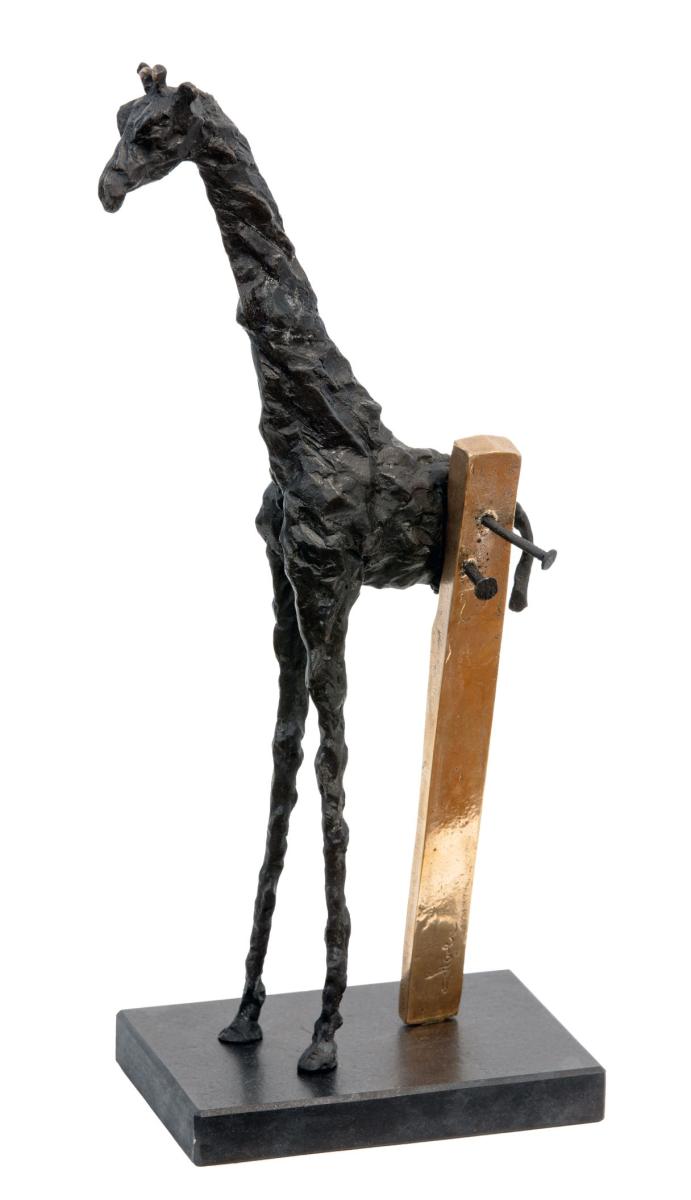 Autor: Petr HolečekNázev: Jak opravit žirafu dvěma hřebíkyTechnika: bronzRozměr: 39x17x10 cm